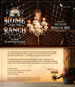 We’re heading west for Okizu’s 31st Annual Art Inspiring Hope Gala. Wrangle your fanciest ballgowns, boots, sequins, and spurs, and join us for a black-tie gala with a western twist — to celebrate our new home on the ranch!